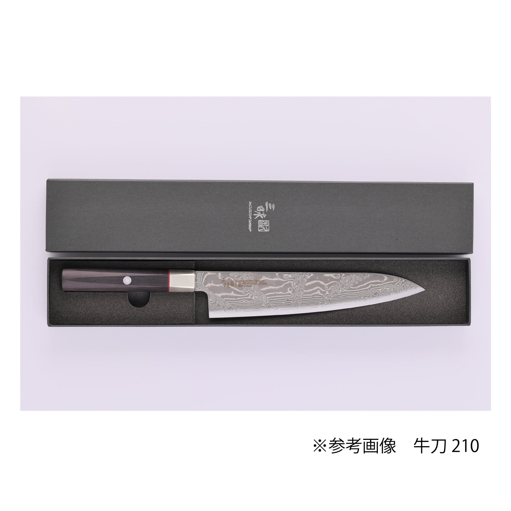 世界的に人気のあるダマスカス鋼を、まるで水しぶきが上がっているような模様にしました。6角と円柱を組み合わせたデザインのハンドルは滑らかに手になじみ、和包丁の良さと洋包丁のよさをハイブリッドした三昧の代表的なモデルです。