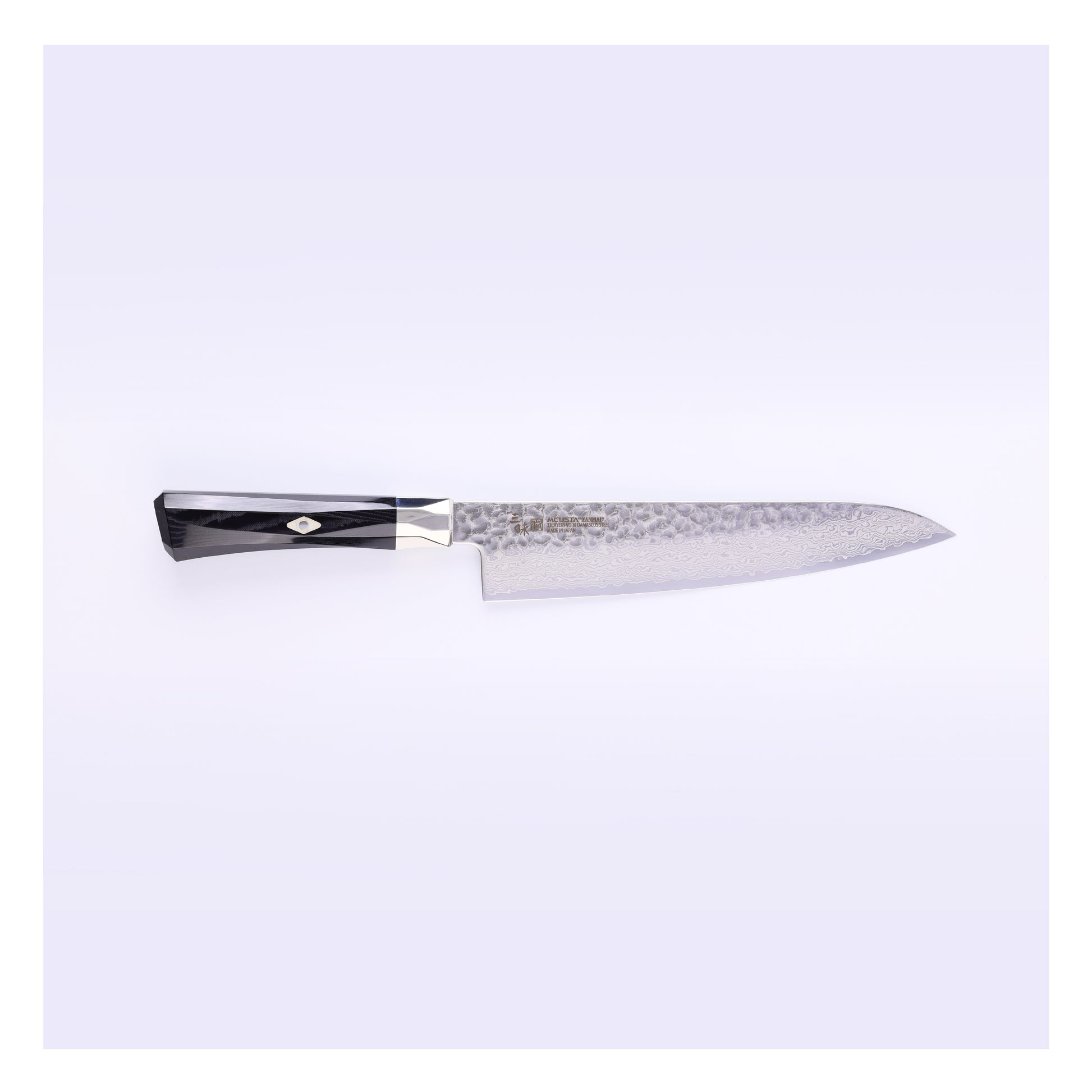 日本の古典的な槌目模様が職人技法を感じさせる、ダマスカス鋼のブレードです。