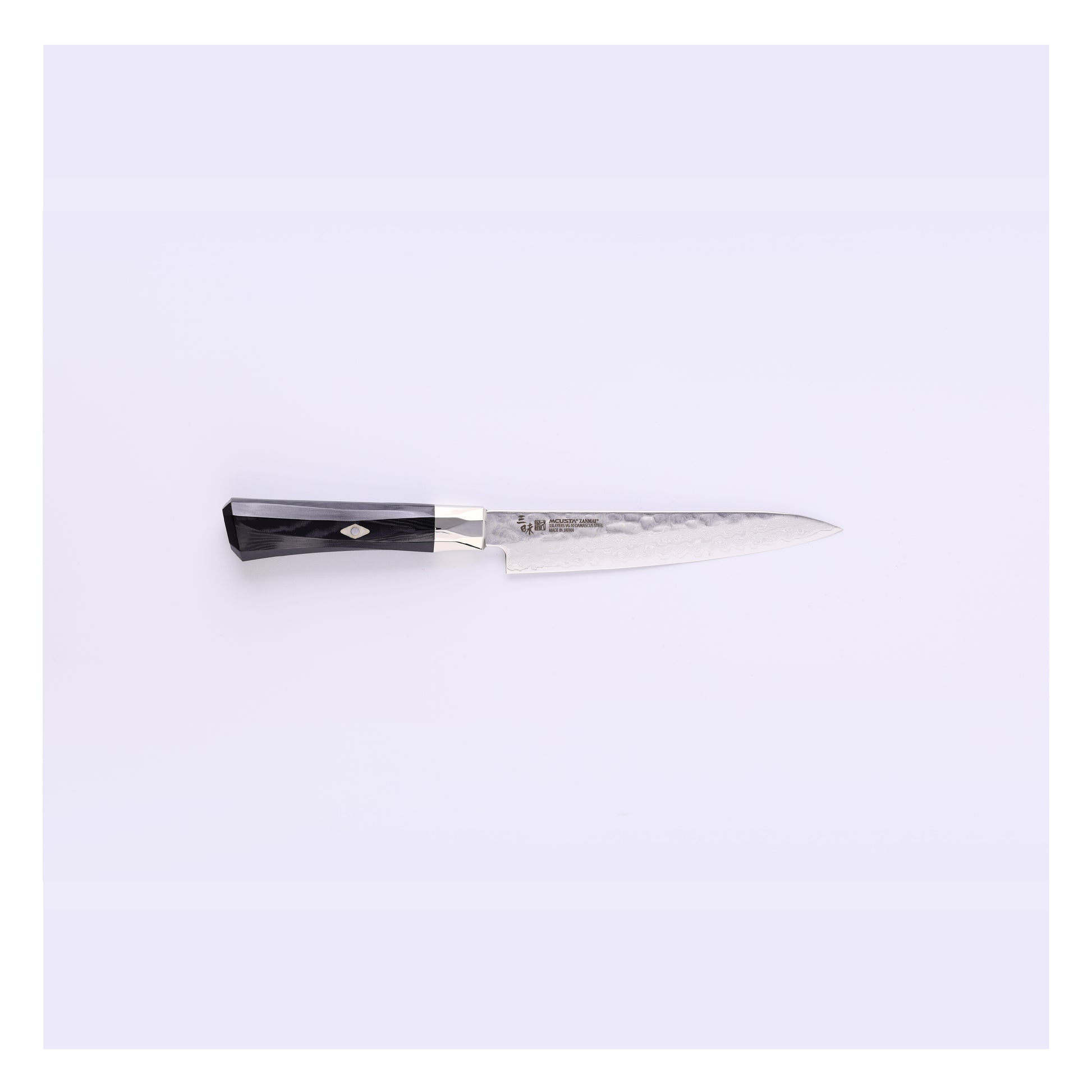 日本の古典的な槌目模様が職人技法を感じさせる、ダマスカス鋼のブレードです。